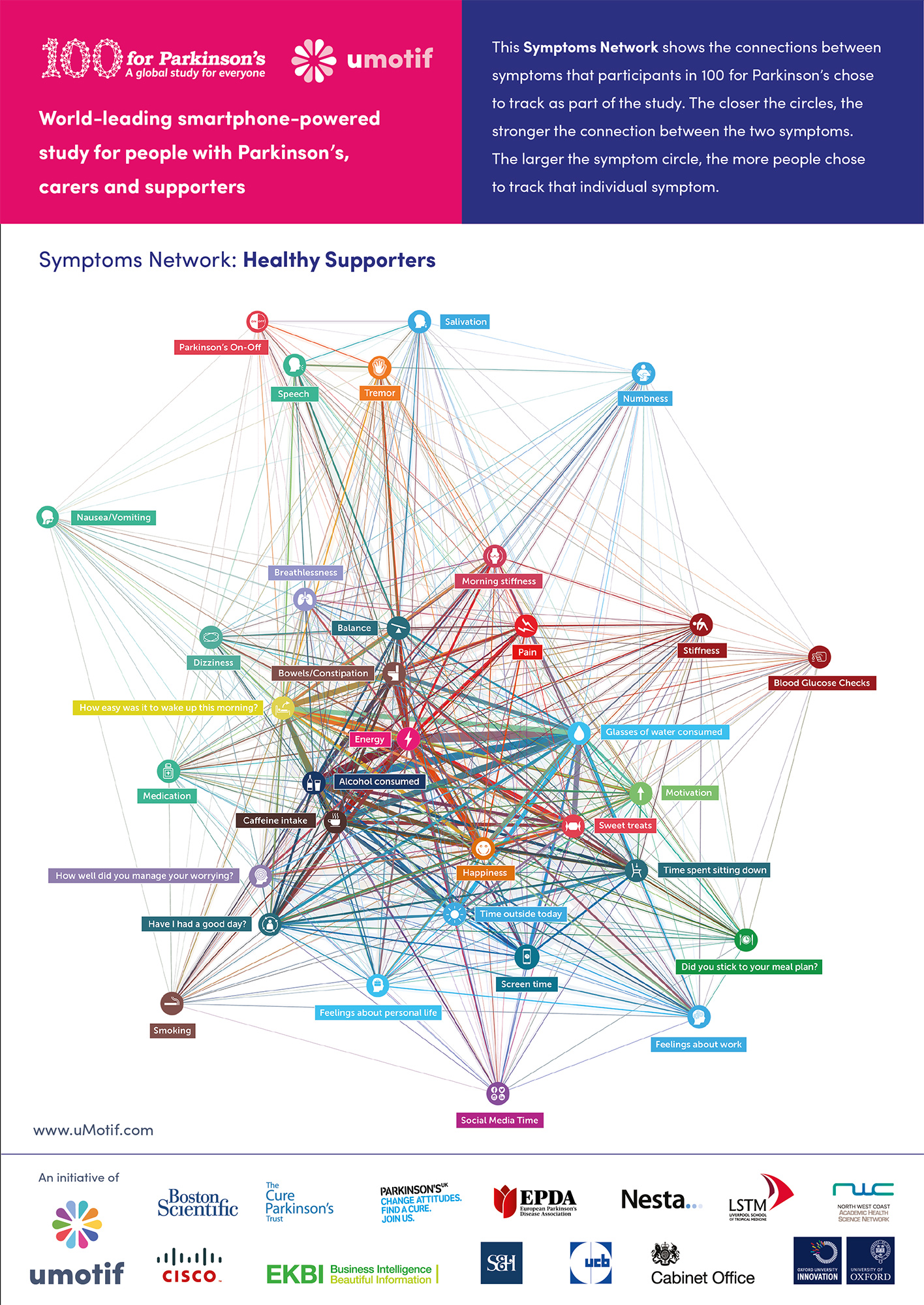 100 For Parkinson’s is an initiative of uMotif supported by The Cure Parkinson’s Trust, Parkinson’s UK, the European Parkinson’s Disease Association, Nesta, Boston Scientific, the Cabinet Office, Cisco, East Kent Beautiful Information, Oxford University Innovations Clinical Outcomes, the Liverpool School of Tropical Medicine, the North-West Coast Academic Health Science Network, Sudler and Hennessey and UCB Pharma. Funding came from Nesta and the Cabinet Office as part of the Centre for Social Action Innovation Fund, a £14 million fund to support the growth of innovations that mobilise people’s energy and talents to help each other, working alongside public services.